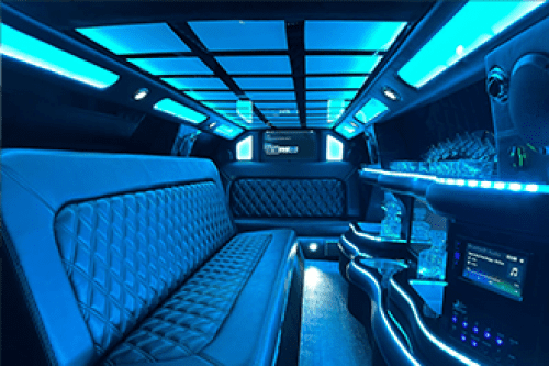 It offers a premium leather interior, big-screen entertainment, climate control, tinted windows/partition for privacy.